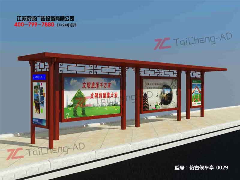 歡迎光臨江蘇泰誠(chéng)設(shè)備科技有限公司 公司專業(yè)生產(chǎn)定做公交站臺(tái)、候車亭,宣傳欄,標(biāo)識(shí)標(biāo)牌等系列產(chǎn)品!